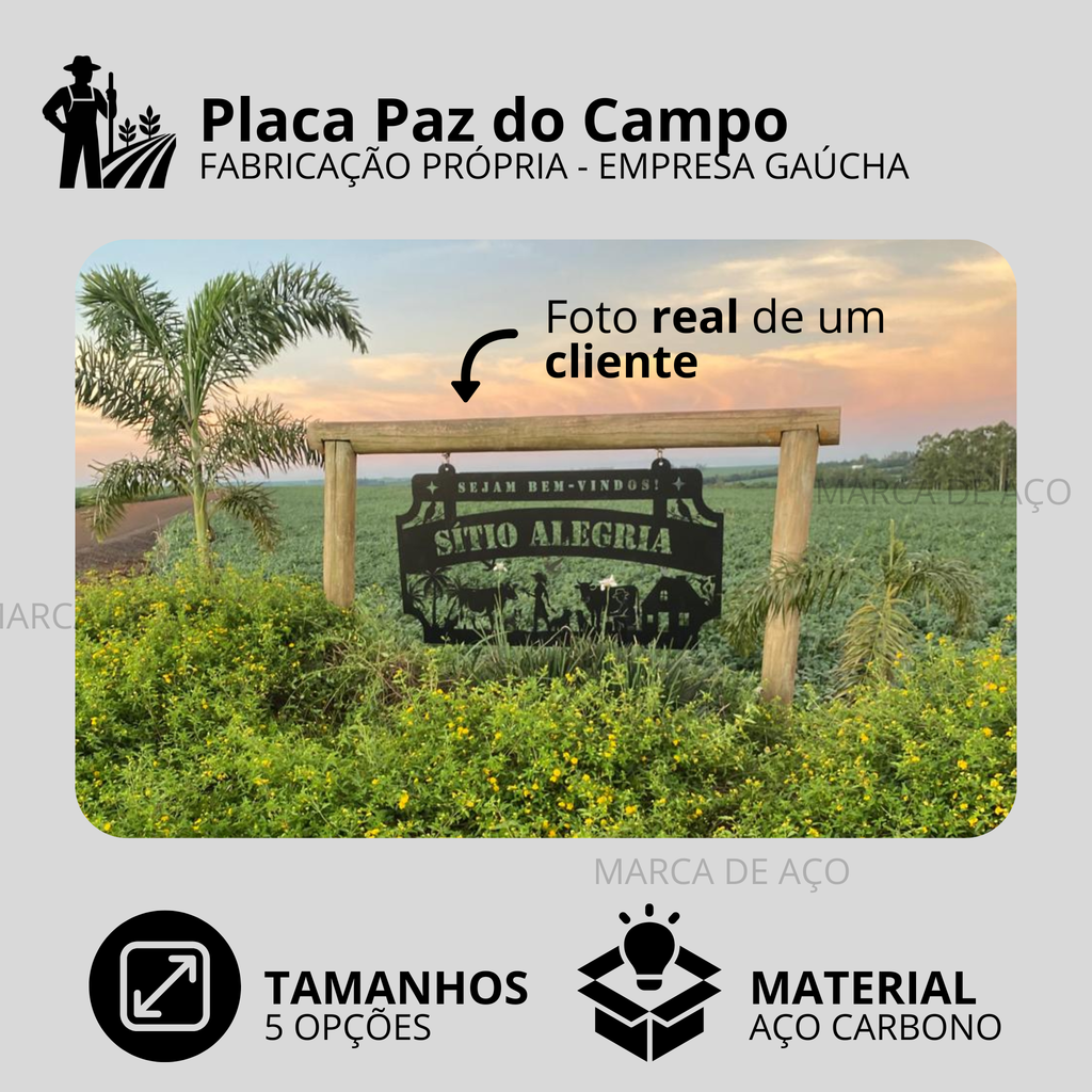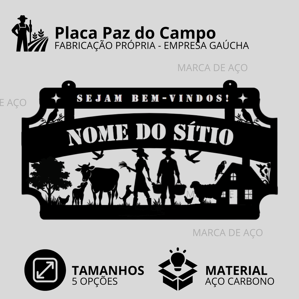 Nós fabricamos essa placa em aço carbono de 1,5 mm, com pintura eletrostática de alta resistência, preparada para ficar no sol e na chuva, mantendo sua beleza por muitos e muitos anos. É perfeita para a entrada de sítios, chácaras, fazendas ou propriedades rurais.