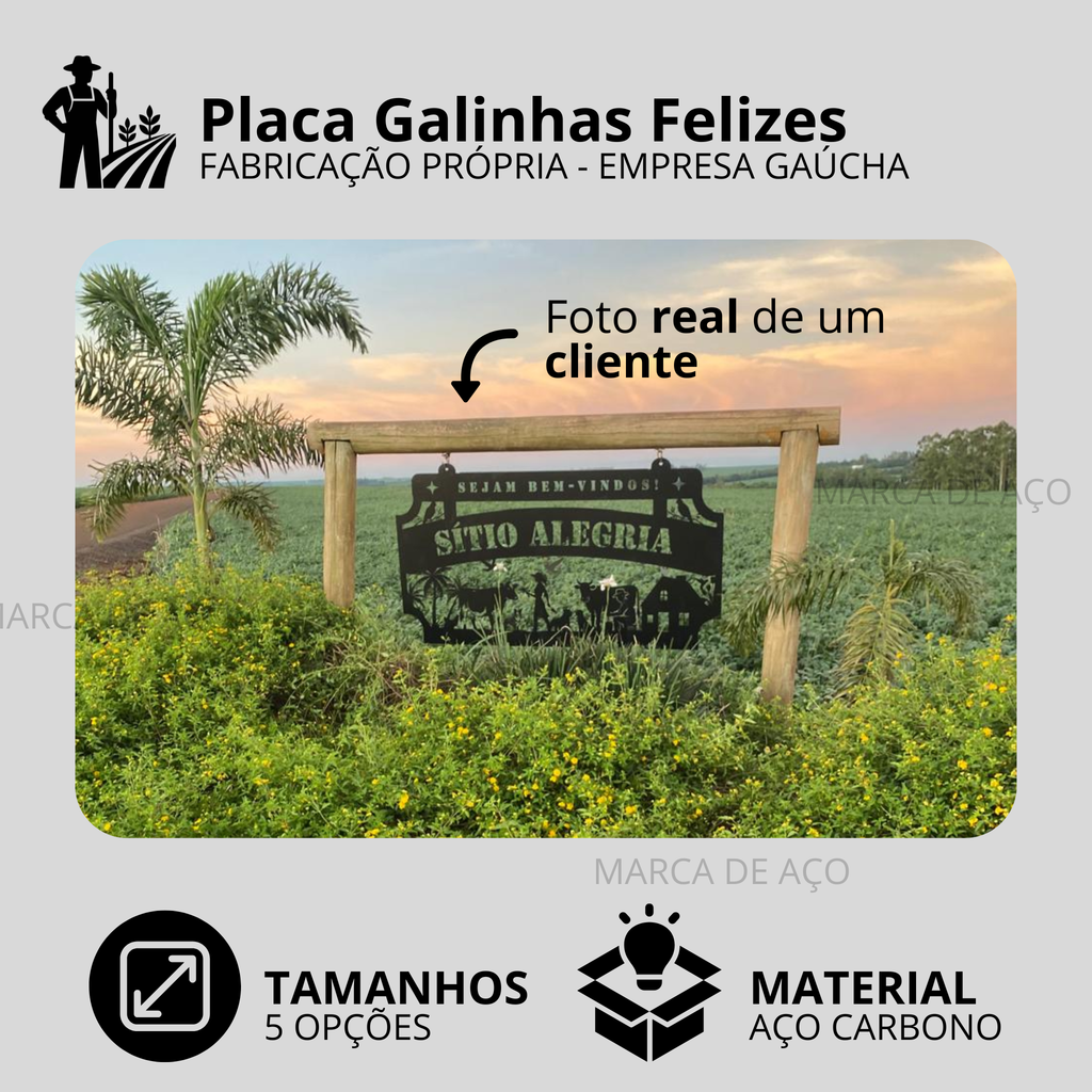 A Placa Modelo Galinhas Felizes é fabricada por nós, em metal de alta qualidade, pensada para quem valoriza durabilidade, acabamento impecável e um visual marcante.