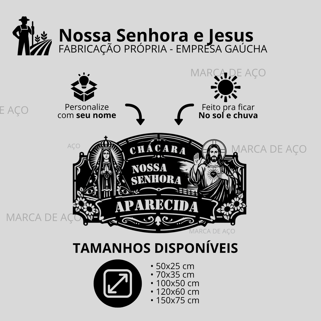 Nós fabricamos essa placa em aço carbono de 1,5 mm, com pintura eletrostática de alta resistência, preparada para ficar no sol e na chuva, mantendo sua beleza por muitos e muitos anos. É perfeita para a entrada de sítios, chácaras, fazendas ou propriedades rurais.